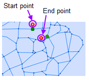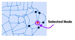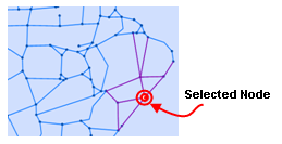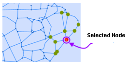 A connected node is a node that can be reached from a selected node on a network. The figure below shows a connected node analysis result with a query level of 2. (The query level is the level of connected nodes to be queried for. The nodes connected to the analysis node with a single edge are first-level nodes; along the analysis direction, the nodes connected to the first-level nodes with a single edge are second-level nodes; similarly, nodes on the third level, the fourth level, and so on, can all be obtained. The search will stop when the level of connected nodes exceeds the prescribed parameter. When the "Query level" is set to 1, the connected node analysis result will be the same as an adjacent node analysis result.)
