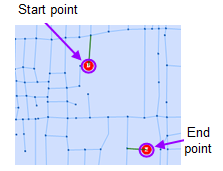 A connected edge is an edge that can be reached from a selected node on a network. The figure below shows a connected edge analysis result with a query level of 2. (The query level is the level of connected edges to be queried for. The edges immediately connected to the analysis node are first-level connected edges; along the analysis direction, the edges directly connected to the first-level nodes are second-level connected edges; similarly, connected edges on the third level, the fourth level, and so on, can all be obtained. The search will stop when the level of connected edges exceeds the prescribed parameter.)