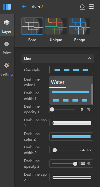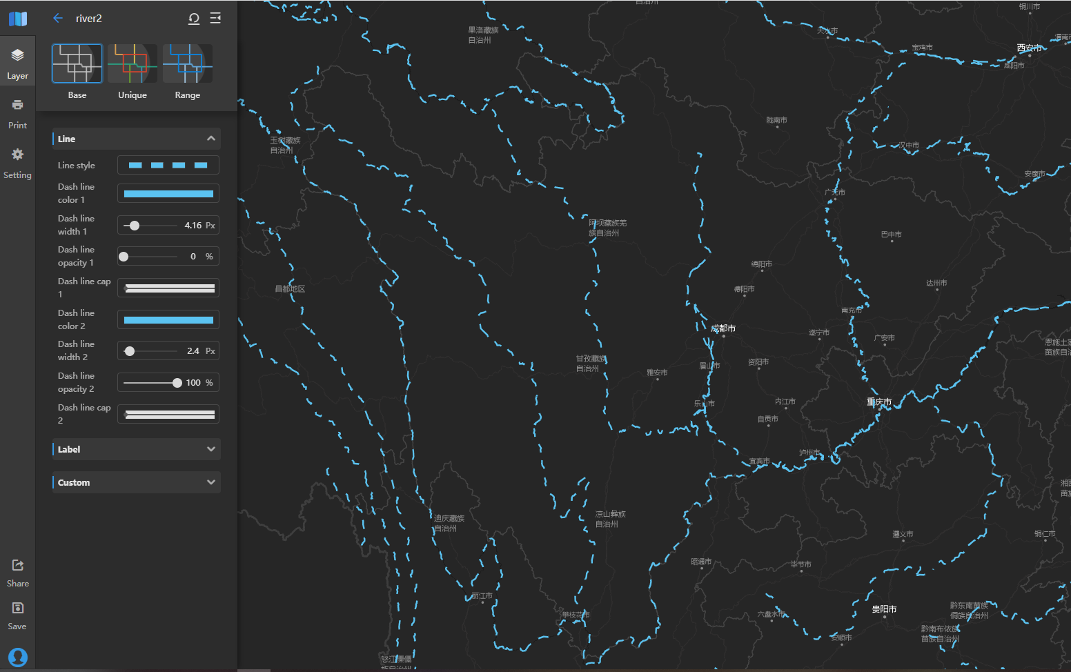 In DataViz WebApp, you can extend of point and line symbol sets to meet the needs of personalized style in vector layers. The custom point styles can be applied to the point layer styles of Base, Unique and Rank Symbol, and the custom line styles can be applied to the line layer style of Base.